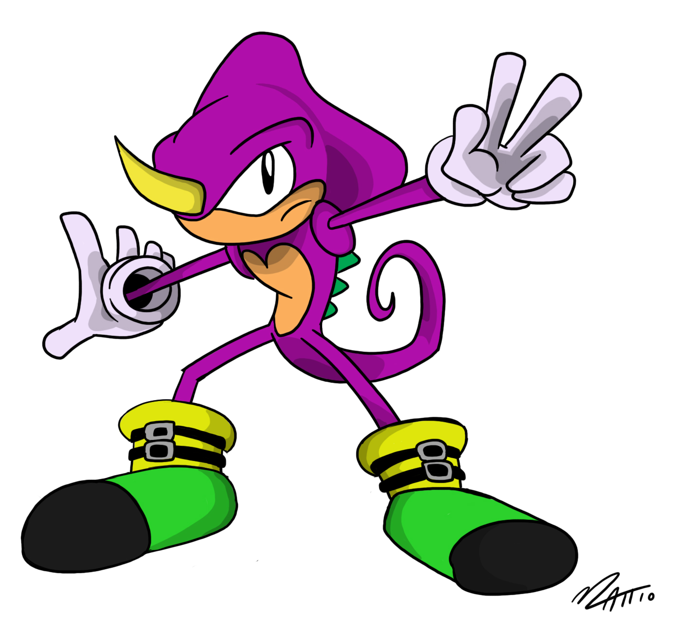 Not my best rendition of Espio, but then again I wouldn’t post this stuff if I didn’t like it in someway. Keep in mind that I am drawing these Sonic characters in their old school designs. I’m not too thrilled of their 2000s revamp. This is how Espio looked in Knuckles’ Chaotix in 1995, before Sega made him a ninja chameleon.